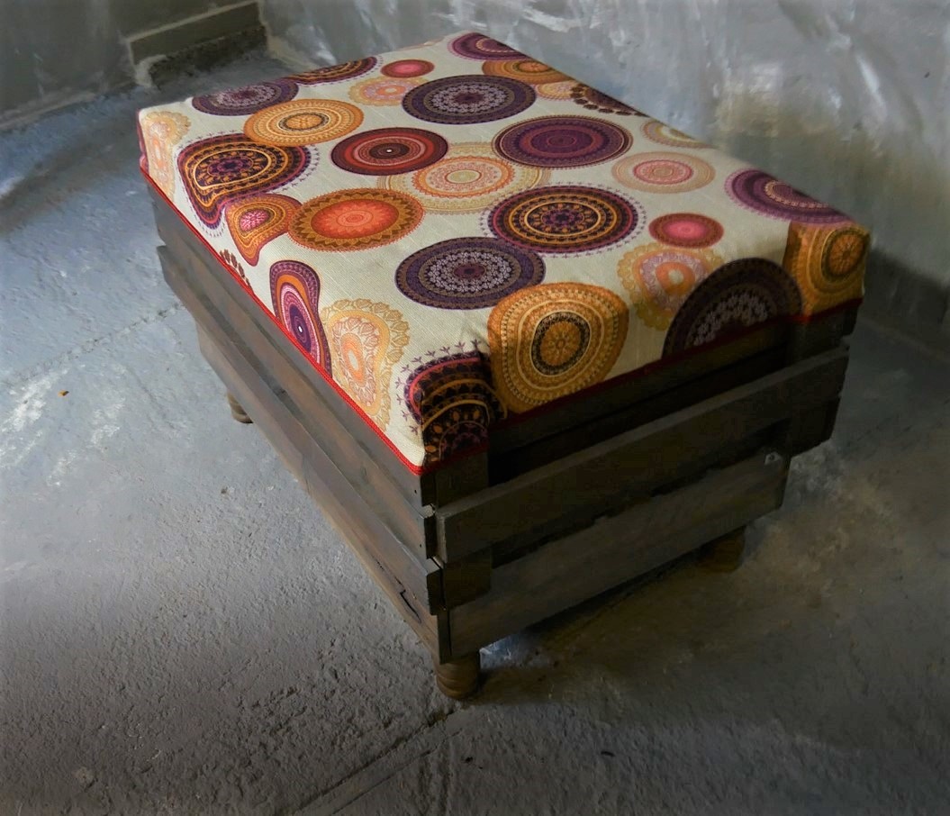 En sittpuff byggd av en gammal potatislåda. Klädd med skumgummi och möbeltyg i retrostil.