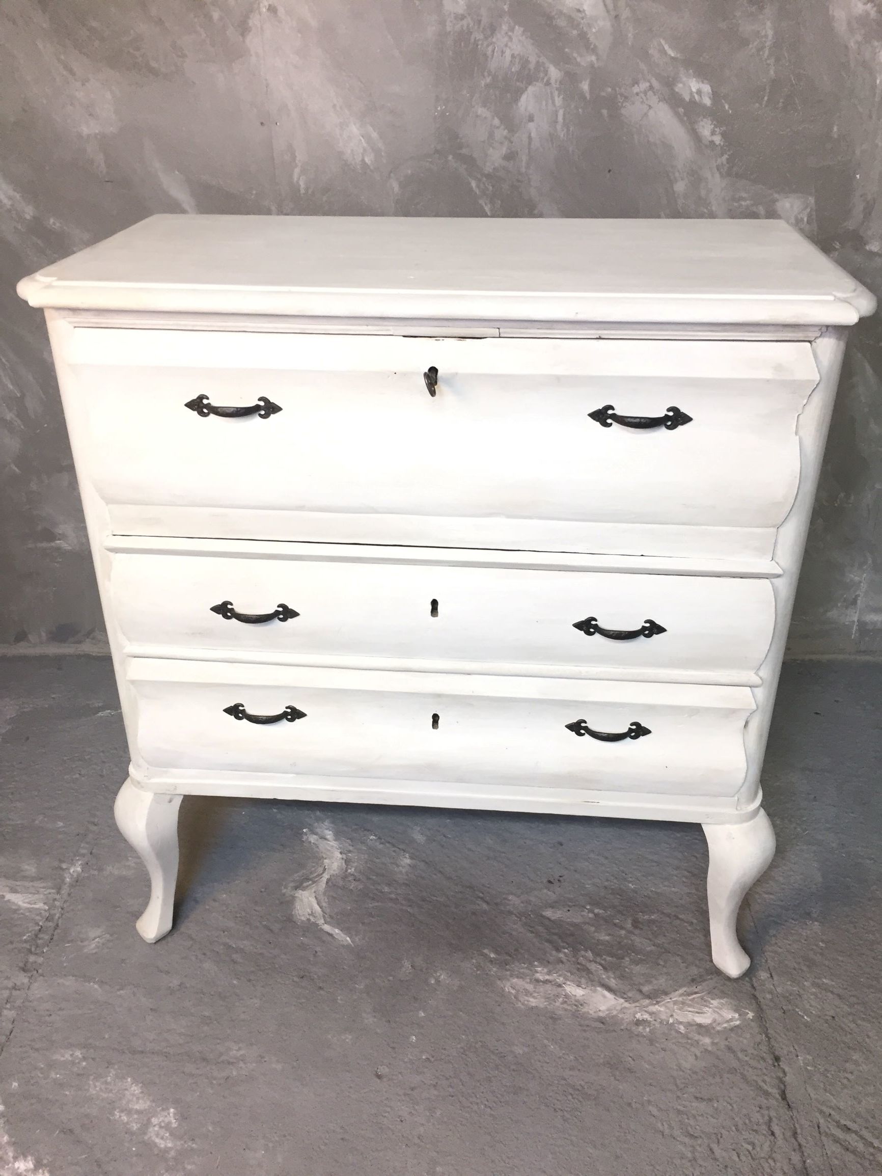 Charmig sekretar men utseende som en byrå. Två riktiga byrålådor. Målad men vit kalkfärg och vaxad med lite ljusbrunt.
