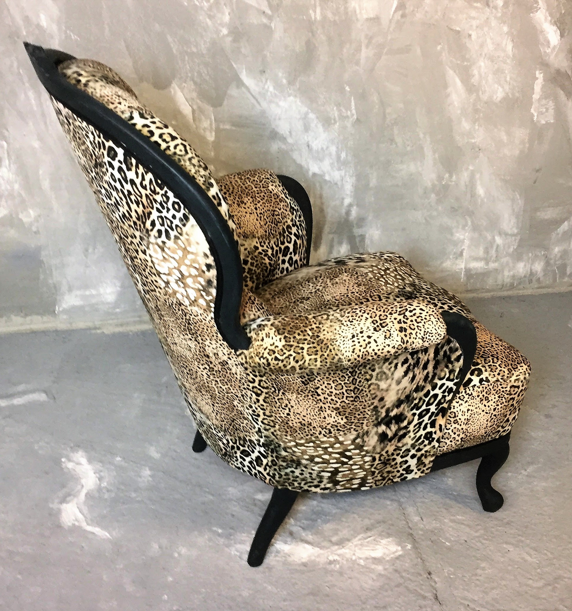 Helhäftig nyrenoverad fåtölj. Nyrenoverad i resåren och nytt möbeltyg i djurmönster.