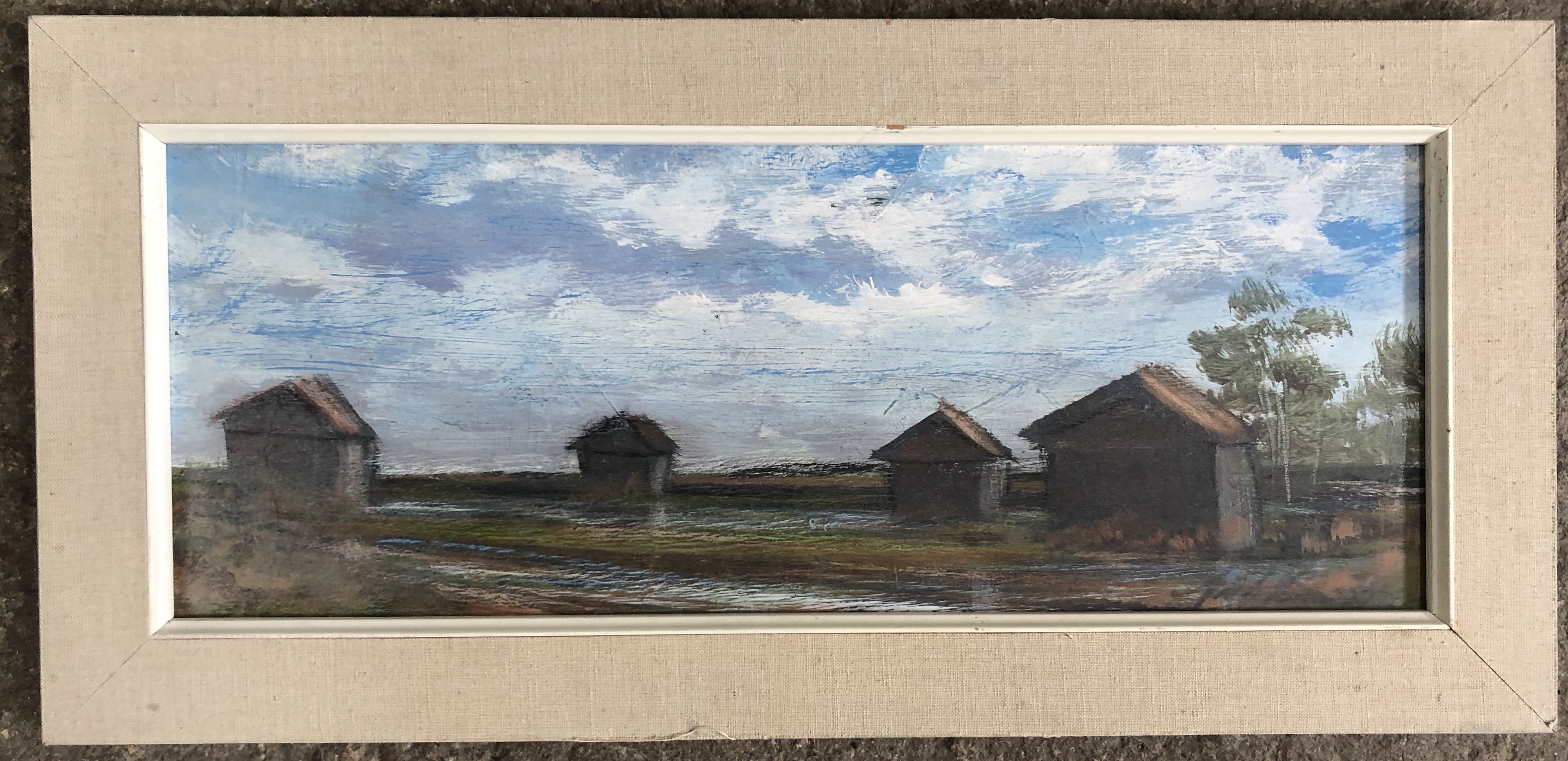 Oljemålning på pannå, Landskap med skjul, otydligt signerad. Oidentifierad konstnär.