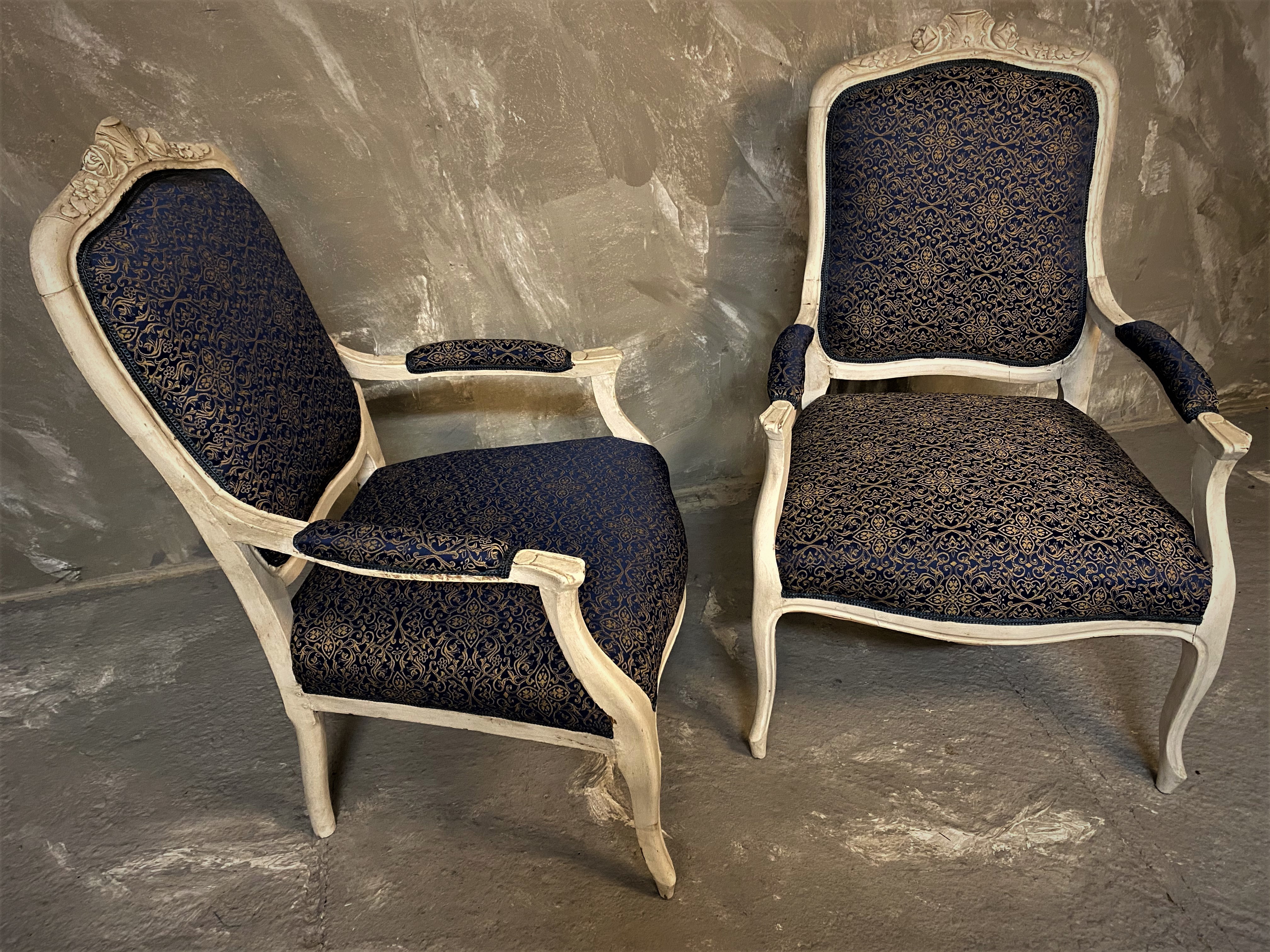 Fina stilstolar målade med kalkfärg och omklädda i snyggt slitstarkt möbeltyg. Tyget blått och guldigt