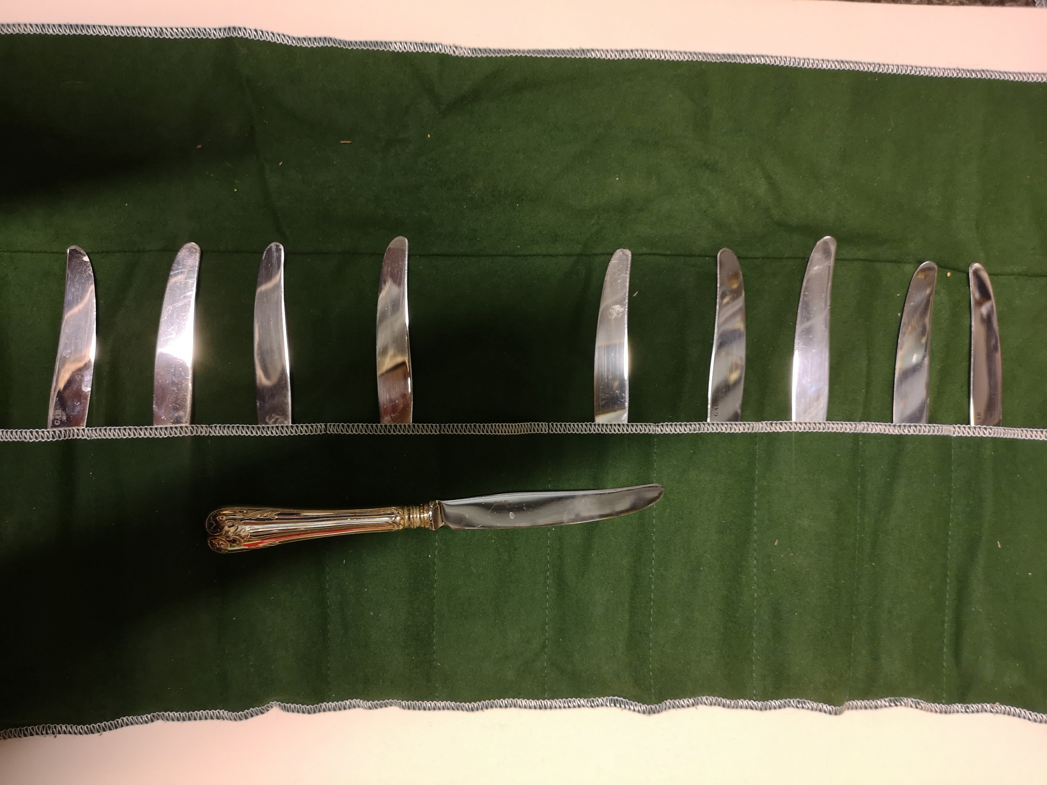 Nysilverbestick: 10 st gafflar, 10 st knivar och 8 st skedar. Besticken är i normal modern varmrättstorlek kommer i gröna filtfodral.