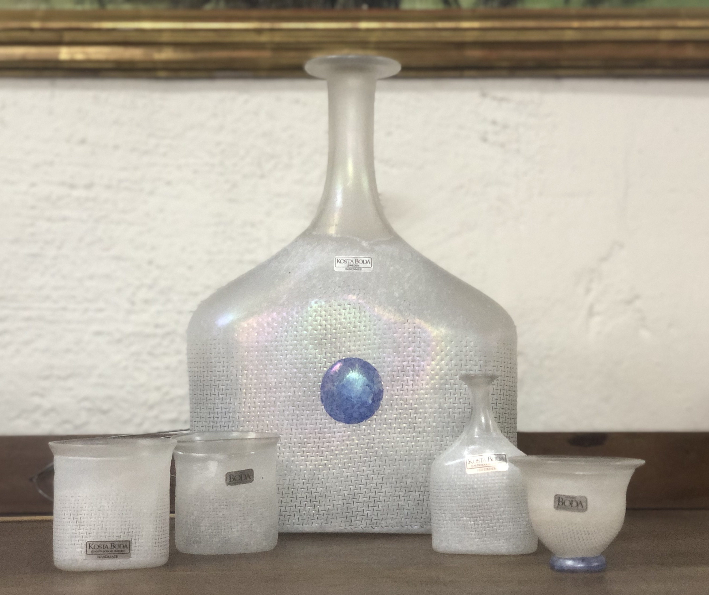 Stor flaska samt fyra små delar från Kosta Boda, design Bertil Vallien, signerade Säljs tillsammans och priset är för alla fem delar