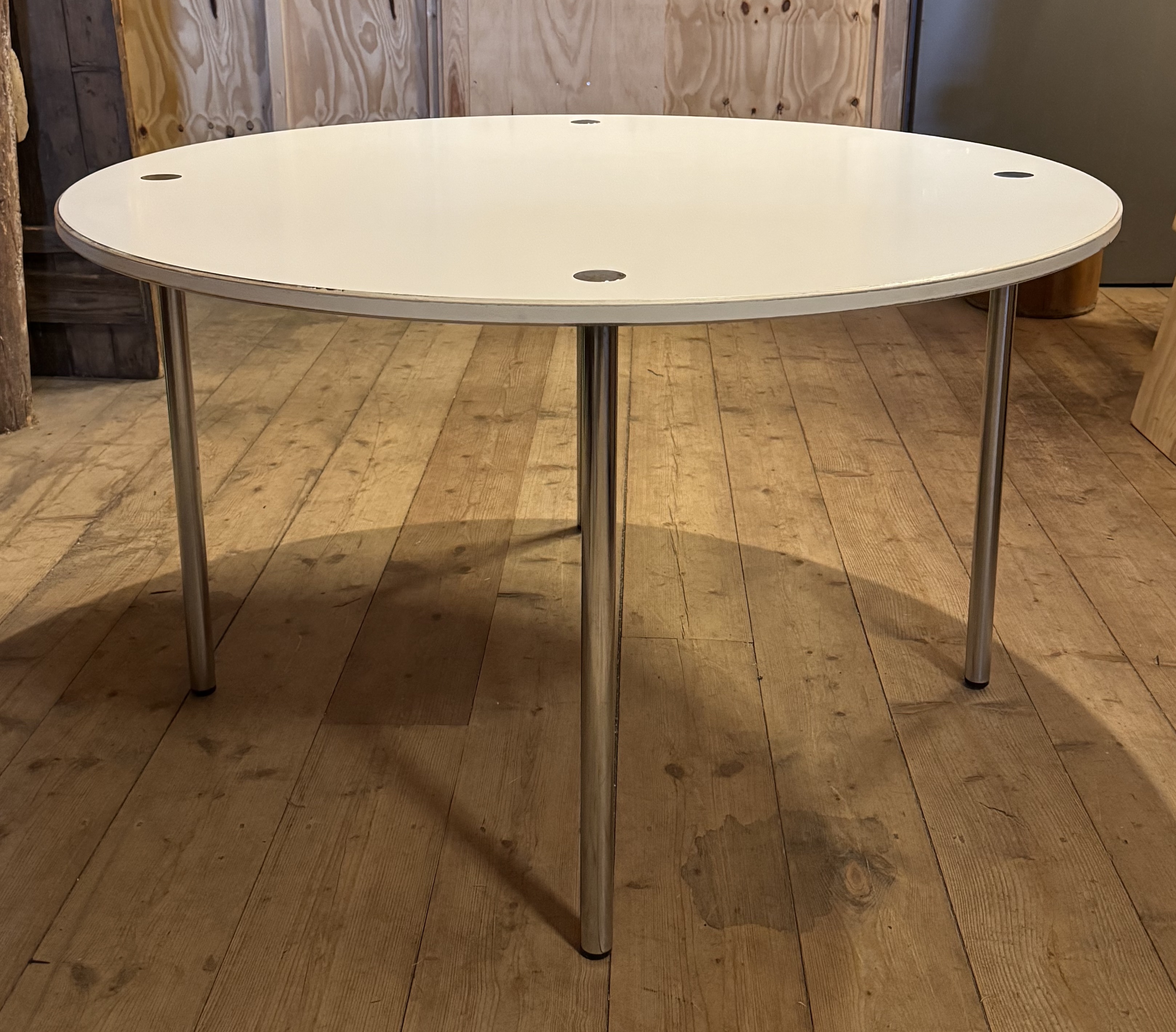 Vitt runt matbord med kromade ben