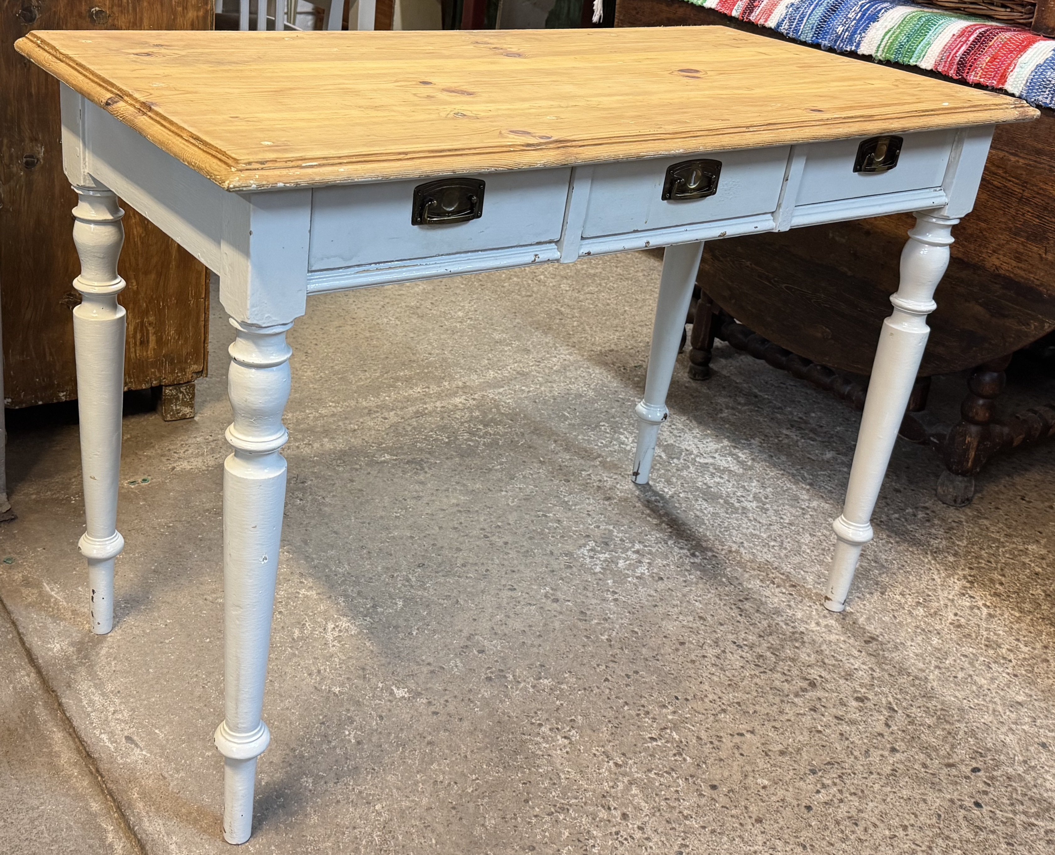 Fint skrivbord med tre lådor samt trären skiva med härlig patina Fler bilder wee.refurn.se